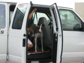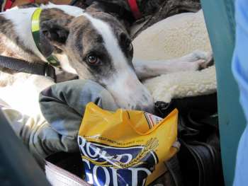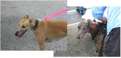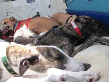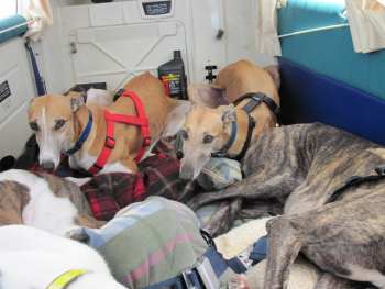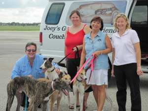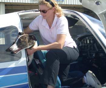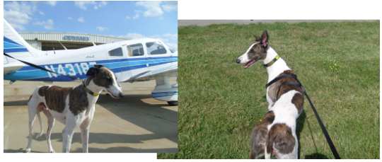 The flight couldn’t have been better!!! At the beginning, Esther was breathing heavily as we headed into the sky. I think she was both hot and nervous. Once we reached altitude, I climbed into the back and took the muzzles off and loosened her seat belt. The temperature at that altitude was about 60 degrees, and she calmed nicely. All the dogs then settled and rested. Bourbon decided to stretch out. They all slept except Okie. He wanted to take it all in. Mike and I were eating pretzels- suddenly a white nose (Okie) popped up between us. Many times Okie would pop his head up front- he loved to have his ears scratched, and I think he wanted his turn to fly too! Ultimately, Okie re-arranged the furniture, moving his pillow around until he finally covered his nose and slept. It was wonderful to see Archie (Nike) again, and to see how happy he looked with his new family. I do think he recognized Triple B. Thank you both for this GREYT adventure. Please do keep me updated as these lucky dogs transition to their new lives. We look forward to doing this again soon!!
