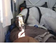 My name is Kayleen, and I am a white greyhound. This has been a very special weekend for me and a couple of my friends. This past Friday morning, the very nice man who feeds us and cares for us at the track got us up and told us to get ready. We were leaving to retire. None of us knew what that meant, but it sounded exciting.