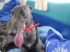 Texas Tea (dark brindle) ran and ran- until she couldn’t keep in front of the pack. Fortunately, her trainer called a friend and connected her lifeline to Brigitte. So off the Miami track and to Ft. Myers she came. She had never lived with a family before, but you would never know. She will come right up to you and hug you.