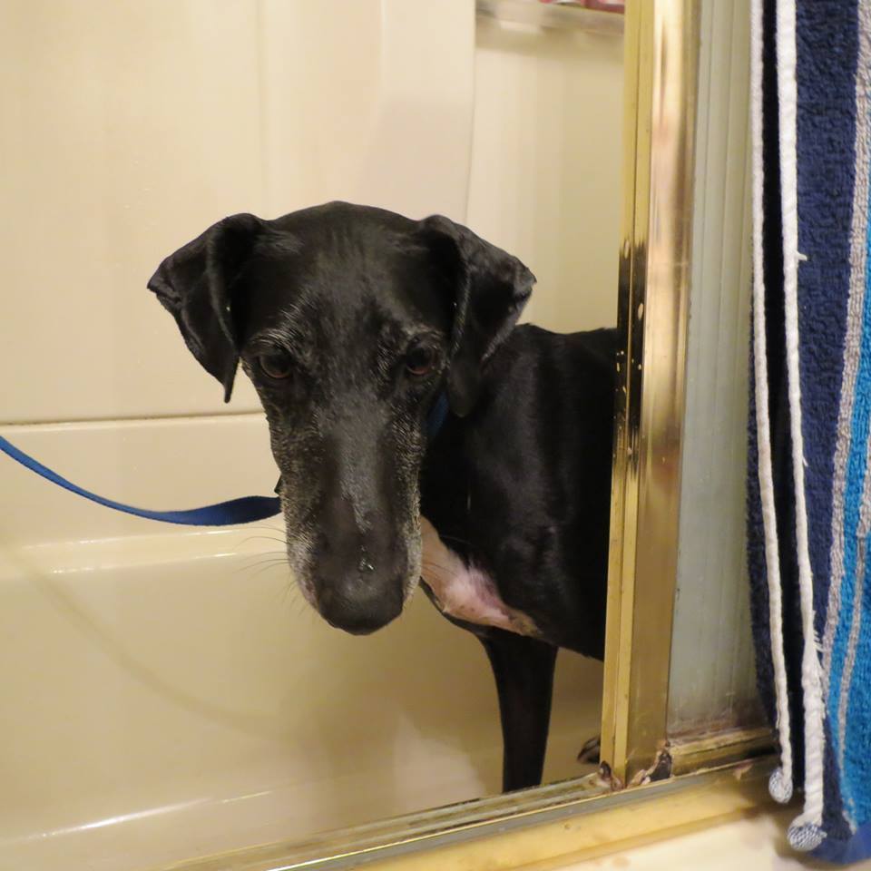 Buder Buder aka Bandit Buder aka Bandit found his Loving Forever Home thru American Greyhound of Indiana. Congratulations to all! Buder after what is likely his first ever bath. He doesn’t look too impressed, but I bet he feels like a handsome dude.